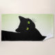 Gato preto vadio com olhos verdes esmeraldas olha por trás da parede preta para uma sala verde.