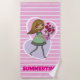 Cute pink and white beach towel featuring a whimsical girl with long flowing yellow hair and wearing a green dress and stripped stockings. She is holding a beautiful bunch of red roses in her outstretched arms. The background is made up of a pink and purple love heart.