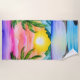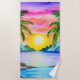 Escape to a glowing shoreline with this Island Tropical Beach Sunset design. Two palm trees frame a calm lagoon and distant mountains as the sun sinks into the water, flooding the sky with rich pink, orange, and golden light that melts into cool turquoise and violet hues. Bold, saturated color and soft gradients give the artwork a dreamy vacation-poster feel, capturing the relaxed warmth of an evening on a quiet island coast.