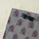 Desenho gráfico, de uma cinza azul, em forma gótica, janela, em cores de; azul, roxo, fuschia, cinza e ouro, contra uma cinza escura, simulação de fundo, uma janela de igreja em vidro manchado.