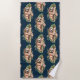 Uma toalha de praia com uma design de aquarela fofa, com uma preguiça fofinha pendurada num galho de árvores rodeado por folhas tropicais verdes. Fundo azul escuro.