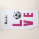 Love Soccer word design com letras faíscas cor-de-rosa quente e o "o" é substituído por uma bola de futebol.