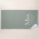 Esta elegante toalha de praia minimalista diz "Sra." em uma fonte branca, moderna, de luxo de alta moda em verde-sábio, e também tem um lugar para seu sobrenome e data de casamento.