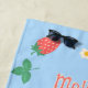 Uma toalha de praia doce que apresenta um padrão delicioso e divertido de minimorangos dispersos em fundo azul. Os morangos são transformados em vermelho vibrante com folhas verdes, e são intercalados com flores de morango brancas e leves, pequenas e delicadas, somando-se ao encanto. A impressão geral é alegre, fresca e doce, fazer ideal para as crianças.