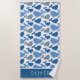 Esta toalha de praia dos azuis marinhos feitos sob encomenda e da baleia cinzenta é fácil de personalizar com um nome para um menino.