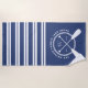 Prepare toalha de praia em azul e branco para sua casa no lago. Adicione seu nome de família, inicial, e o ano estabelecido a um monograma náutico de remos cruzados sobre um círculo de corda. A toalha da praia também apresenta listras azuis e brancas.