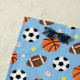 Uma toalha de praia com esportes - o teste padrão temático de uma seleção do equipamento da bola dos esportes gosta do basquetebol, do futebol americano, da bola de futebol, do basebol, da bola de tênis e de uma bola de golfe. A cor do fundo pode ser mudada. Excelente para os meninos que amam esportes! Adicione o nome no espaço azul da bandeira fornecido.