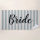 Toalha de praia simples, azul-na moda e listrada de marfim, personalizada com letras grandes de script do Bride ou personalizada com seu nome ou outro texto. Use as ferramentas de design para mudar as fontes e cores do texto ou adicionar suas próprias fotos para criar uma toalha de praia personalizada para sua festa de solteira, lua de mel ou um presente de casamento único.
