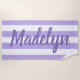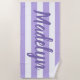 O design personalizado de toalha de praia apresenta texto personalizado em um roteiro roxo moderno que pode ser personalizado com um primeiro ou sobrenome contra um padrão de listras brancas em um fundo roxo claro. As cores e o estilo de fonte podem ser completamente personalizados.