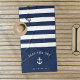 Suba o seu jogo de barco com estas toalhas de praia personalizadas em faixas náuticas, azuis e brancas, de marinho. Personalize com o nome do seu barco e o registro do navio (ou nome do capitão) em letras brancas com uma ilustração de âncora.