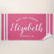 Design personalizado de toalha de praia para uma viagem de fim de semana feminina apresenta um nome personalizado em um roteiro moderno, escrevendo por listras costeiras, com texto personalizado para a ocasião. A cor de fundo rosa quente pode ser modificada. Visite nosso compro para obter outras opções de cor.