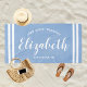 Design personalizado de toalha de praia para uma viagem de fim de semana feminina apresenta um nome personalizado em um roteiro moderno, escrevendo por listras costeiras, com texto personalizado para a ocasião. A cor azul de fundo da cinza empoeirada pode ser modificada. Visite nosso compro para obter outras opções de cor.