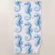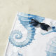 Toalha de praia de padrão azul e branco. Design apresenta um belo padrão do cavalo marinho em tons azuis de aquarela, colocados contra um fundo branco pristino. Esta toalha de praia é o acessório perfeito para um dia relaxante perto do oceano ou soltando perto da piscina.