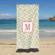 Toalha de praia monogramada, com um monograma cor-de-rosa, no centro, sobre um padrão de folhas botânicas tropicais verdes e flores exóticas cor-de-rosa.