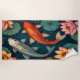 Um colorido par de peixes koi nadam entre lírios-d'água nesta bela toalha de praia. Cena natural pacífica e serena.