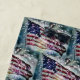 Esta imagem de bandeira americana, é destacada contra, fogos de artifício que explodem, em uma exibição colorida de fachos vermelhos, brancos, azuis e amarelos - em um céu nublado e iluminado, de azul ardente.