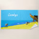 Esta toalha de praia apresenta um impressão de fotos de arte digital da praia Benaulim em Goa, Índia, e você pode personalizá-la com seu nome. O impressão está estilizado e mostra a vasta praia em amarelos brilhantes contra um mar azul turquesa e o céu. A proa de um barco local pendurado com miçangas está no lado direito e você pode ver vacas e ciclistas na praia. As cores principais são a areia amarela e o azul-turquesa brilhante do céu.