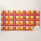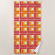 Esta toalha de praia tem um design geométrico de L's em vermelho, laranja e amarelo, colocados em diferentes direções num campo de branco.