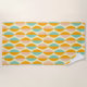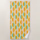 Repeating geometric pattern with overlapping leaf shapes in orange, teal, and pink on a beige background. The design conveys a retro, vibrant feel.