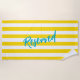 Cute yellow and white cabana stripe beach towel, with the word Reserved. Fun pool vibe towel for your day club party or beach vacation.