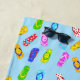 Esta bela toalha de praia apresenta um adorável padrão de sandálias de flutuação de sacudir em diferentes cores e padrões num fundo azul claro.