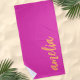 Toalha de praia com seu nome em uma fonte de script laranja em um fundo rosa-quente magenta. Design de cor e cor.
