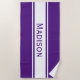Aproveite esta toalha de praia personalizada na praia ou na beira do polo. Esta design tem uma cor roxa roxa roxa sólida de fundo com listras brancas e uma fonte moderna. Este é um presente fantástico para férias de família, festas ou eventos. O nome e a cor podem ser personalizados nas opções de personalização.
