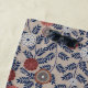 Seamless floral pattern featuring stylized dark blue leaves and multi-colored flowers in muted terracotta, gray, and white against a beige background.