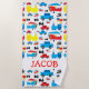 Características deste design uma colagem de ilustrações bonitos e coloridas dos planos, do trem, e dos carros. Personalize com o nome de sua escolha que aparecerá em uma pia batismal vermelha do divertimento perto da parte inferior do design. Faz um grande presente para qualquer pequeno quem ama carros, planos, e/ou trens.