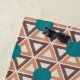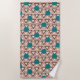Esta toalha de praia tem uma design geométrica de triângulos castanhos e bronzeados repetidos com círculos de turquesa em cima de um campo esbranquiçado. Quer o mesmo design em cores diferentes? Me mande mensagem.