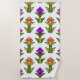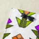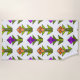 Esta toalha de praia tem um design de deco de arte feito de diamantes, triângulos e tulipas de fazer de polígonos em laranja e roxo com caules e folhas verdes.