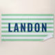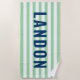 Design de toalha de praia personalizada apresenta texto personalizado em simples e moderno todas as letras de bonés que podem ser personalizadas com um nome próprio. O texto azul do marinho contrasta um fundo verde-claro e branco com um padrão na moda de faixas horizontais. As cores e o estilo de fonte podem ser completamente personalizados.