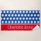 Esta torre de praia divertida apresenta estrelas brancas em azul com uma faixa vermelha e branca brilhante que você pode personalizar com sua escolha de nome ou texto especial.
