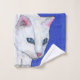 Este pano de lavagem tem a cabeça e a face de um gato branco com olhos azuis brilhantes sobre um fundo azul vibrante profundo com minúsculos brilhos como pontos brancos.