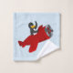 Toalha com design, ilustrada com um pinguim que voa num plano vermelho; ilustrada por Radka Kavalcova/MaxiHarmony
