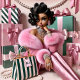 Mulher-quiteira cercada por presentes de Natal rosa e verde