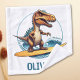 Esse tecido de lavagem personalizado e divertido para crianças apresenta um dinossauro trex assustador e engraçado surfando no mar.