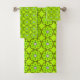 Toalhas verdes brilhantes com padrões circulares intrincados pendem de uma haste e são exibidas dobradas. O design exala uma estética geométrica e vibrante.