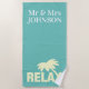 Toalhas de praia em lua de mel para o Sr. e a Sra. recém-weds. Ideia de presente de casamento elegante para casais recens casados. Cor de plano de fundo azul ou personalizada com gráfico de palma da árvore. Carregue sua própria imagem opcionalmente. Crie um para ele e para ela. Excelente para destinos de casamento de verão, praia, piscina e muito mais. Os presentes dele e dela para o novo marido e mulher.