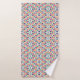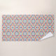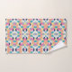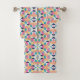 Toalhas e um pano de rosto com estampas vivas e desenhos florais coloridos e de folhas em tons de azul, rosa e laranja, transmitindo uma atmosfera vibrante e alegre.