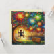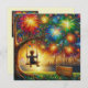 Um menino em uma árvore balançando assiste a uma exibição de uma obra de fogo e celebra o aniversário de Toby. As saudações no cartão são "Feliz Aniversário Toby". Na parte traseira da placa está uma pequena versão da imagem frontal e muito espaço para escrever uma mensagem. Feito com o auxílio do AI Bing.