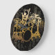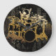 Reproduzindo o relógio de parede Contemporâneo do tambor com um tambor em ação. As cores são preto e ouro.