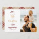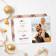 Cartão fotográfico para sua pequena alegria. Perfeito para o primeiro Natal de um bebê ou para o cartão de Natal dos filhos. Xadrez festiva de trás em vermelho e ouro.
