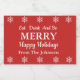 Etiqueta de vinho espumante de Natal perfeito que diz "Coma Bebida e Seja Feliz Feliz Feriados de ______" em cores clássicas de vermelho e branco com o design de floco de neve tradicional, que deve ser personalizado com seu sobrenome