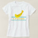 Uma t-shirt de Verão decorada com uma grande banana amarela e as palavras TOP BANANA na frente, com listras azuis e verdes acima e abaixo das palavras. Divertido e bonito ao mesmo tempo, adequado para qualquer um e perfeito para a praia. Por que não ser uma banana de cima?