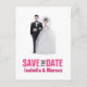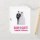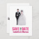 Se você ama kitsch, mas é definitivamente moderno, este é um ótimo cartão postal de save the date que pode enviar um sorriso. Um topo de bolo de noiva e noivo retrô é apresentado na frente, mas o tipo é todo contemporâneo. Detalhes personalizados do seu evento vão no verso. Disponível em cores alternativas com produtos correspondentes.