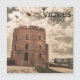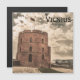 Cartaz Vintage de Vilnius. monumento da torre Gediminas em Vilnius, Lituânia. Pequena torre de tijolos de laranja com bandeira lituana na colina contra a bela vista no centro histórico da cidade de Vilnius.