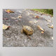 Um preço barato por uma foto incrível. Uma tartaruga determinada a caminho de uma rodovia pacífica de cascalho, decorada com folhas de outono e turfa de fundo. Foto tirada por Annalisa Huie de uma Tortoise Russa.