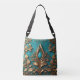 Golden petals and leaves set against a turquoise background cover this pretty tote bag.