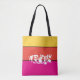 Este saco de tote de tamanho médio na moda é mostrado em magenta, tangerina e amarelo com uma faixa escura fina e alças em um bloco de cor listrada com o texto especial Vegas. Personalize este item ou comprar como está.